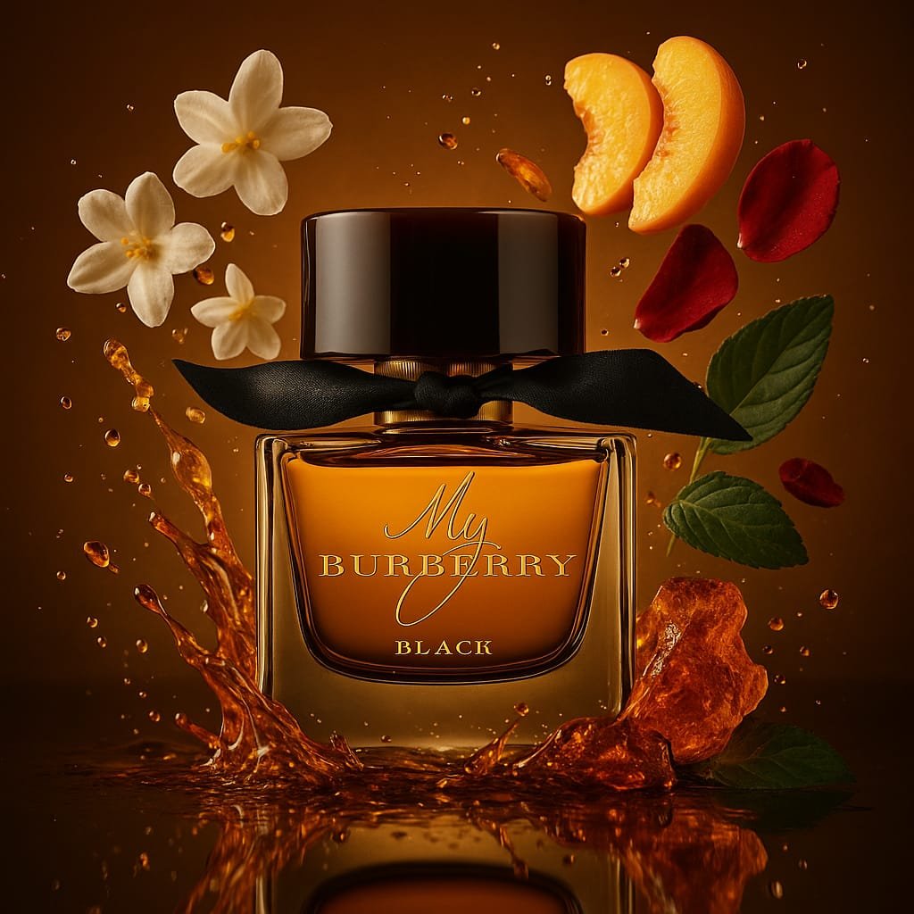 My Burberry Black is an opulent and sensual parfum for women, inspired by a London garden at dusk. This rich, intense fragrance opens with sweet and juicy peach nectar, blending seamlessly into a heart of blooming jasmine and rose soaked in candied amber. The base is warm and seductive, featuring patchouli and smoky accords that leave a lasting impression.